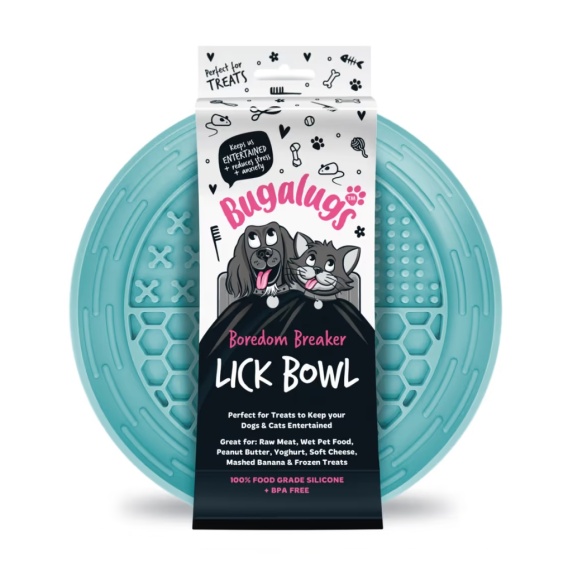 Bugalugs Lick Bowl for Dogs & Cats łączy w sobie cechy miski na karmę i klasycznej - płaskiej maty do lizania. Zarówno na dnie, jak również na ściankach jest pokryta rozmaitymi wypustkami. Jest idealnym podłożem do podawania mokrej karmy, masełek, jogurtów i innych przekąsek. Zapewnia zwierzętom rozrywkę dzięki zróżnicowanym kształtom wypustek, które zachęcają do lizania i eksploracji. Lizanie maty stymuluje wydzielanie śliny, promując zdrowsze zęby i dziąsła. To również świetny sposób na uspokojenie zwierzaka podczas kąpieli, zabiegów pielęgnacyjnych lub stresujących sytuacji, takich jak strzelające fajerwerki. Serwowanie głównego dania w misce do lizania zamiast w tej tradycyjnej spowalnia czas spożywania posiłku, pomagając zmniejszyć wzdęcia i wspomagając trawienie.