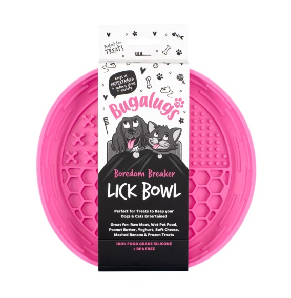 Bugalugs Lick Bowl for Dogs & Cats łączy w sobie cechy miski na karmę i klasycznej - płaskiej maty do lizania. Zarówno na dnie, jak również na ściankach jest pokryta rozmaitymi wypustkami. Jest idealnym podłożem do podawania mokrej karmy, masełek, jogurtów i innych przekąsek. Zapewnia zwierzętom rozrywkę dzięki zróżnicowanym kształtom wypustek, które zachęcają do lizania i eksploracji. Lizanie maty stymuluje wydzielanie śliny, promując zdrowsze zęby i dziąsła. To również świetny sposób na uspokojenie zwierzaka podczas kąpieli, zabiegów pielęgnacyjnych lub stresujących sytuacji, takich jak strzelające fajerwerki. Serwowanie głównego dania w misce do lizania zamiast w tej tradycyjnej spowalnia czas spożywania posiłku, pomagając zmniejszyć wzdęcia i wspomagając trawienie.